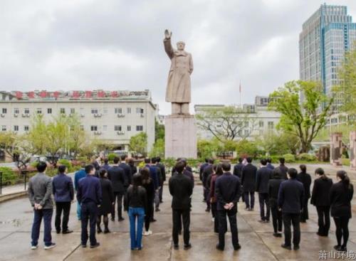 在毛主席紀(jì)念像前,全體職員靜默肅立、三鞠躬表達(dá)對偉人首腦毛主席的高尚敬意和深切吊祭,瞻仰偉人英容,追憶偉人事跡,重溫入黨誓詞。