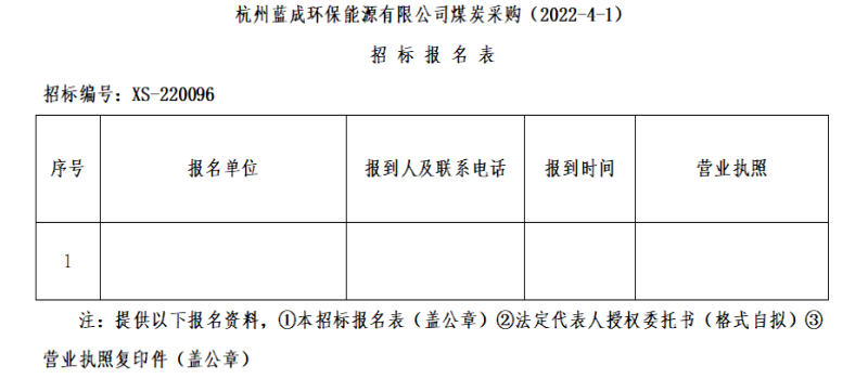 二、招標(biāo)項(xiàng)目:杭州藍(lán)成環(huán)保能源有限公司煤炭采購(2022-4-1)。