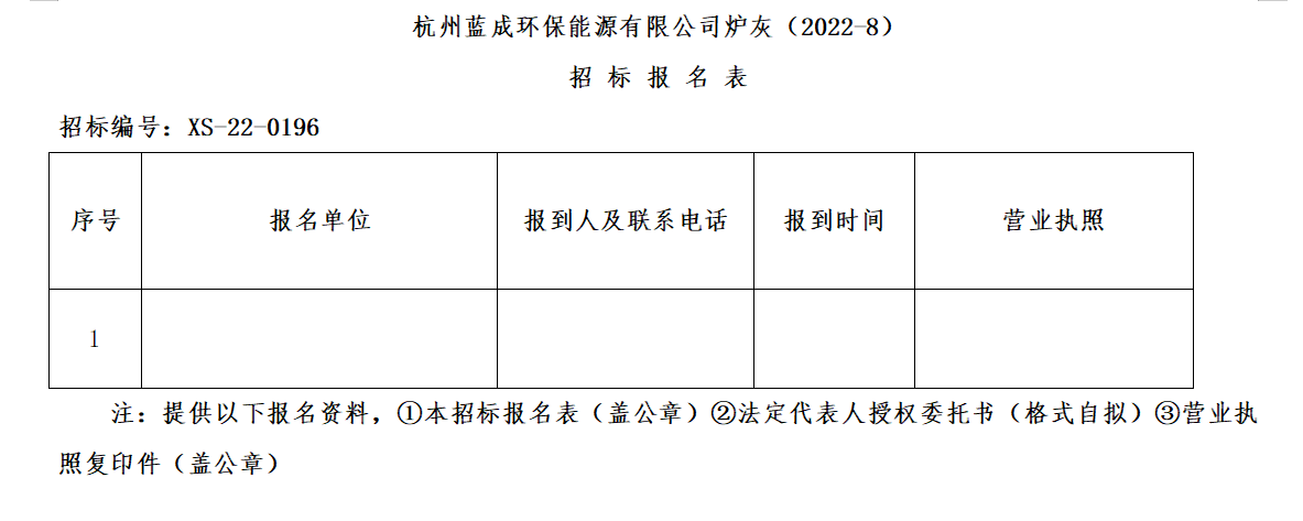 憑證杭州蕭山情形集團(tuán)物資招標(biāo)管理要求,杭州藍(lán)成環(huán)保能源有限公司對“杭州藍(lán)成環(huán)保能源有限公司爐灰(2022-8)”舉行果真招標(biāo)。