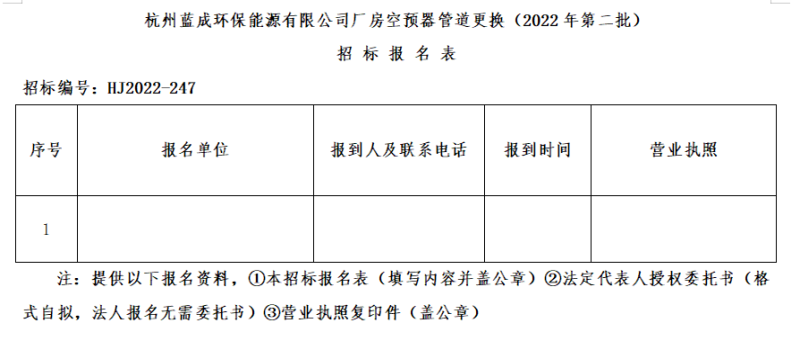 七、招標(biāo)答疑時(shí)間:投標(biāo)人對招標(biāo)文件若有疑問,請于2022年9月24日16時(shí)00分前以書面形式(可傳真、掃描件)并加蓋公章提交杭州藍(lán)成環(huán)保能源有限公司。