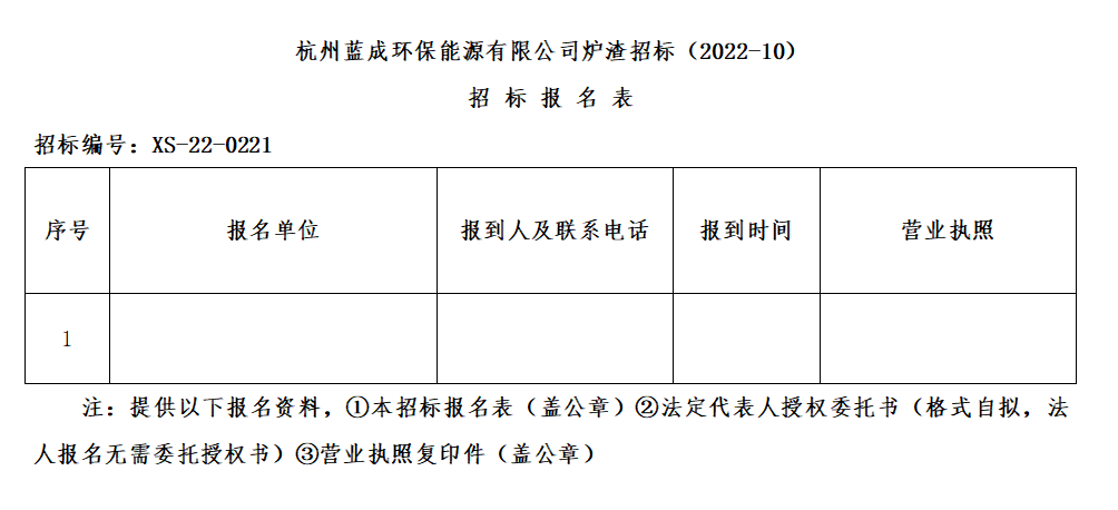 杭州藍(lán)成環(huán)保能源有限公司,憑證杭州蕭山情形集團(tuán)物資招標(biāo)管理要求,對杭州藍(lán)成環(huán)保能源有限公司爐渣招標(biāo)(2022-10)舉行果真招標(biāo)。