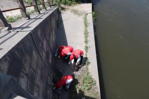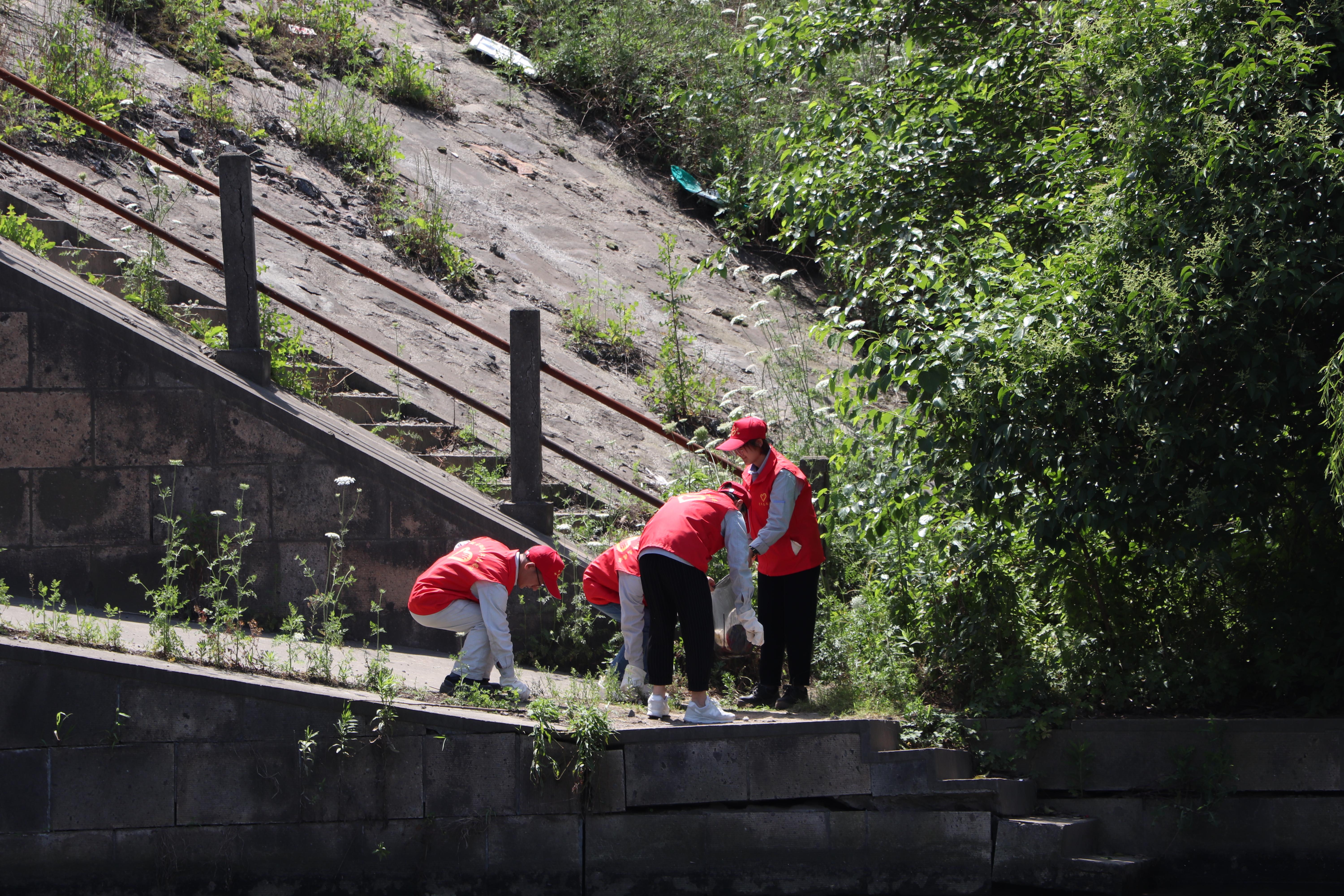 隊(duì)員們順著臺(tái)階走到岸邊,俯身撿拾河岸邊的垃圾。放棄漁具、飲料罐、香煙盒、零食袋,紛歧會(huì)兒,隊(duì)員們手上的垃圾袋滿滿當(dāng)當(dāng)。