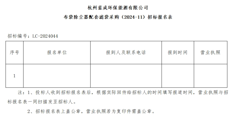 二、招標(biāo)項目:杭州藍(lán)成環(huán)保能源有限公司布袋除塵器配套濾袋采購(2024-11)。