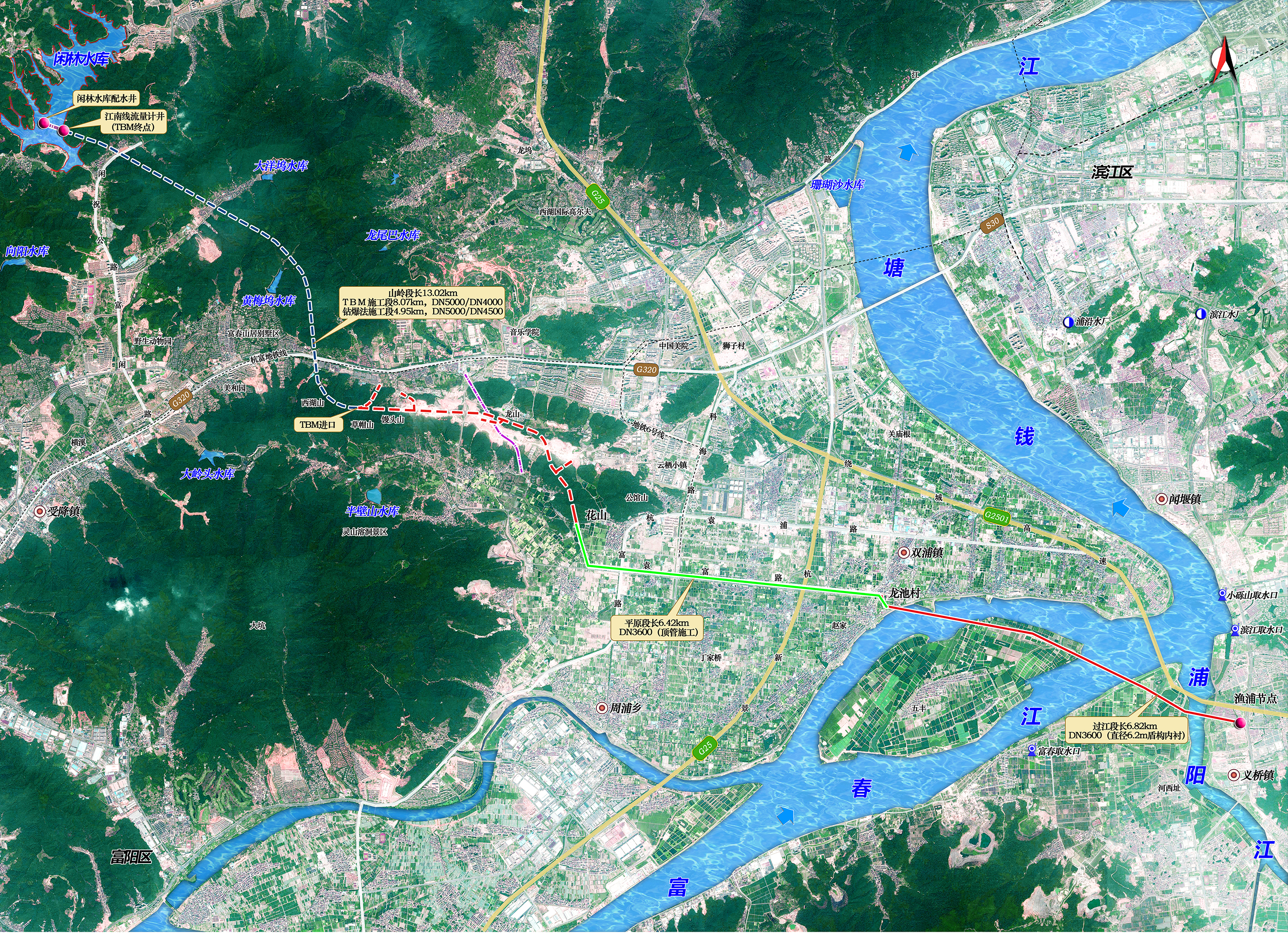 工程自余杭閑林水庫配水井最先,新建輸水隧洞和管道,途經(jīng)余杭、西湖、富陽、蕭山四個行政區(qū),最后至蕭山漁浦節(jié)點,總長約26公里,總投資約30億元,全線分3個標(biāo)段分段開工建設(shè),劃分為山嶺段、平原段和過江段。