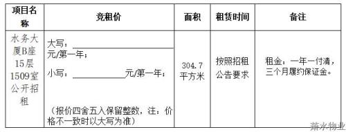1、憑證貴方水務(wù)大廈B座15層1509室果真招租項(xiàng)目的通告, 遵照有關(guān)劃定,我方愿以以下報價肩負(fù)招租要求。