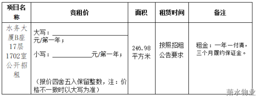1、憑證貴方水務(wù)大廈B座17層1702室果真招租項目的通告, 遵照有關(guān)劃定,我方愿以以下報價肩負(fù)招租要求。