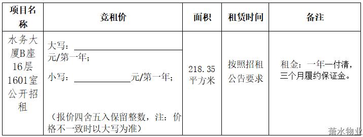 1、憑證貴方水務大廈B座16層1601室果真招租項目的通告, 遵照有關劃定,我方愿以以下報價肩負招租要求。